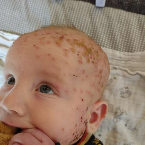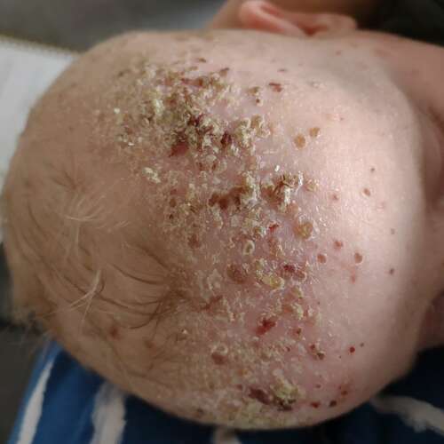 Hoi Geertje, mijn zoontje heeft 2 maanden geleden soortgelijke gelige korstjes gehad op zijn hoofdje. Het bleek ontstoken Berg te zijn. Er was een bacterie (impetigo/krentenbaard) in gekomen en daardoor geïnfecteerd. Het breidde vrij snel uit in zijn gezichtje en mijn zoontje had ook zichtbaar jeuk ervan. Op recept kun je er zalf voor krijgen maar wij zijn er uiteindelijk met een antibioticum kuur vanaf gekomen omdat het vrij hardnekkig was. Daarmee ging het wel snel beter gelukkig. Ik ben geen arts dus ik kan niet beoordelen of dit hetzelfde is, maar het doet me er wel aan denken als ik de foto zie. Ik zou zeker vragen om een second opinion. Arm mannetje. Sterkte!