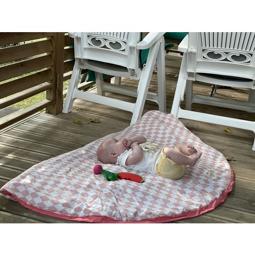 Ik moet eerlijk toegeven, het vangt wel wat pluisjes, maar ik heb zo een onthaarroller en ik was het ook geregeld. Onze kleine man zevert en geeft soms wat melk terug, dusja 🙈 het wordt echt vaak gewassen. + ligt zijn junglegym er voor de helft ook nog op. Het is een handig speelkleed om overal naartoe te nemen en best groot en niet aan de dure kant. Het is wel dun. Daarom ligt het ook op de puzzelstukken. Het beste speelkleed is het dus niet, mr het is best ok. Eerlijk denk ik dat die Love by Lily dezelfde pluisjes zal vangen.