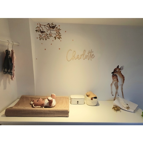 https://www.waggelenvriendjes.nl/Muursticker-bosdieren-baby-en-kinderkamerdecoratie wij hebben deze op de muur gedaan. Werkt prima