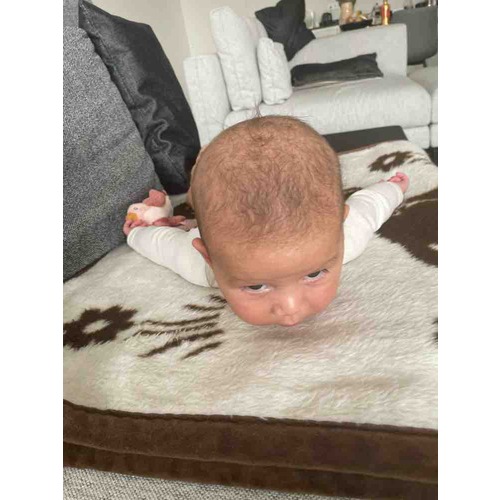 Onze dochter is 9 weken en niets leek te werken. Bij alles wat we probeerden begon ze te krijsen. Van de vk de volgende tip gehad en nu na enkele dagen tilt ze al ruim een minuut haar hoofd omhoog:
