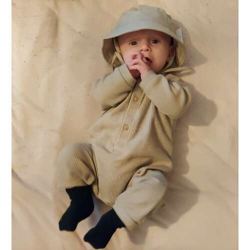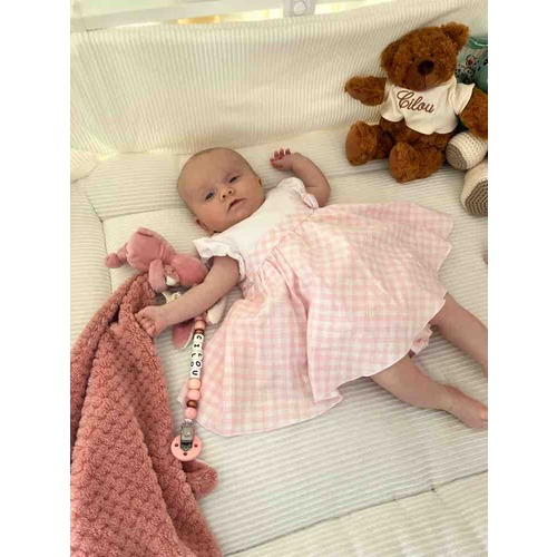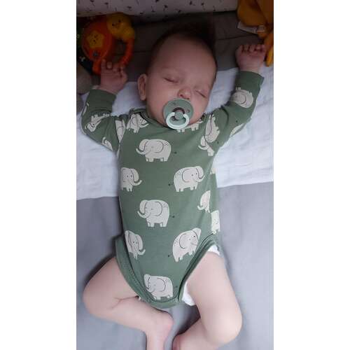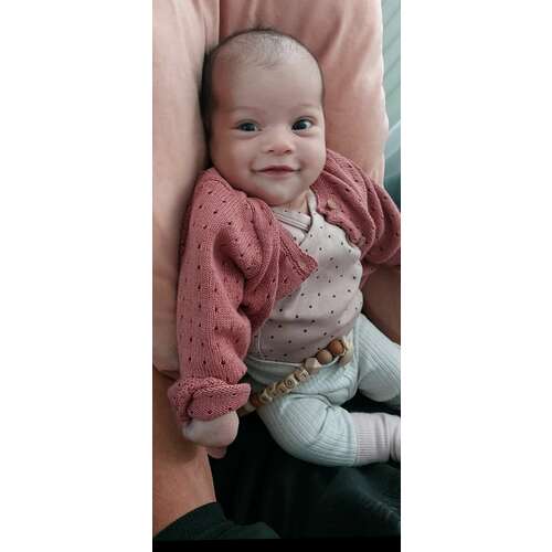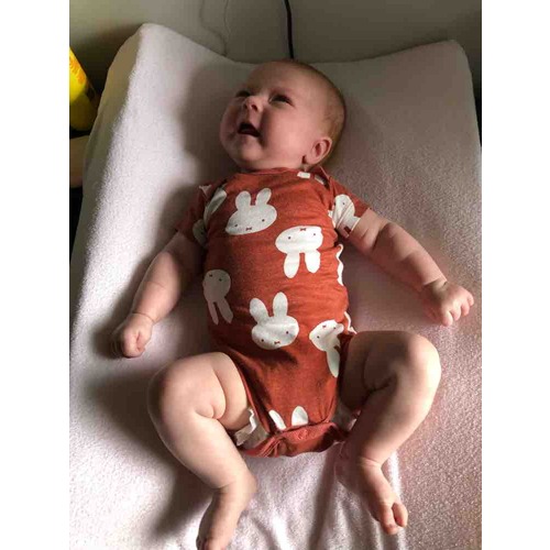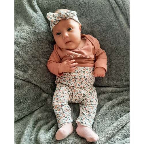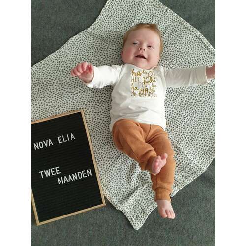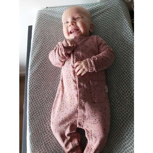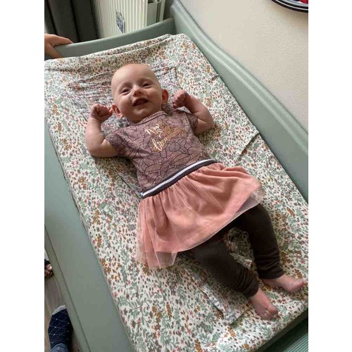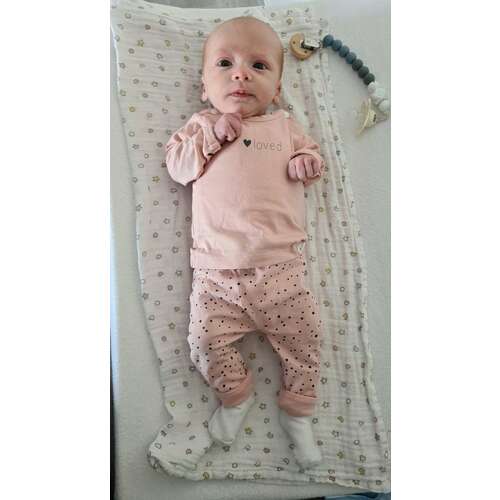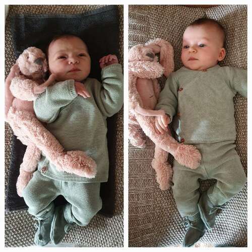 Ella 2 dagen versus 7 weken. Geboren met 3265 gram en weegt nu 4770 gram. Had maat 50 en past er nog steeds in maar wordt wel een beetje krap.