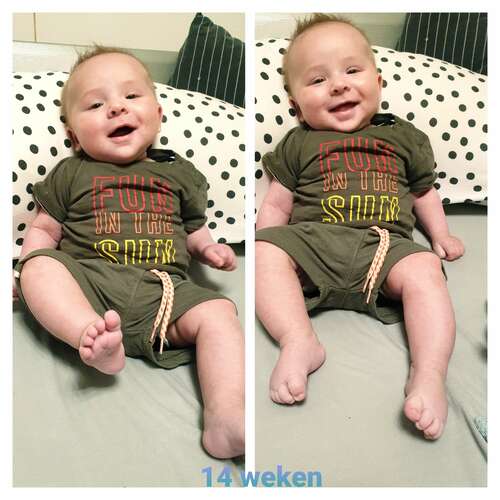 9+5 weken alweer. 6120gr en 59cm groot. Hij past veel kleding in maat 56 al niet meer 😑, dus langzamerhand al maat 62.