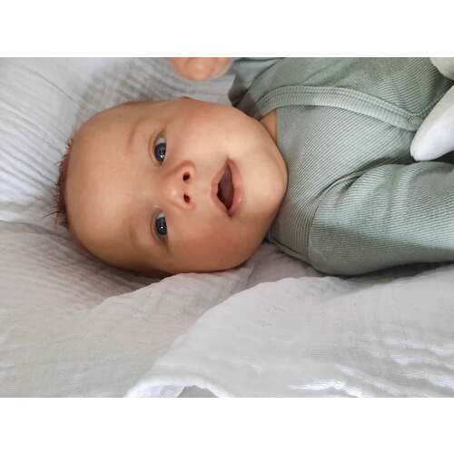 Hier 9 weken oud, 57 cm en 5 kg. Kleding net over naar maatje 62