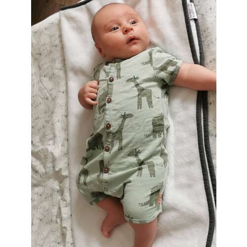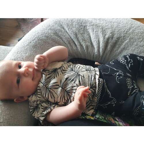 Georgie is 9 weken oud, 6,6 kg en intussen 61 cm. Hij heeft meestal maat 62 aan maar wordt nu krap omdat ie best zwaar is. Dit pakje is voor t eerst maatje 68 🙈 zit wat comfortabeler 😂.