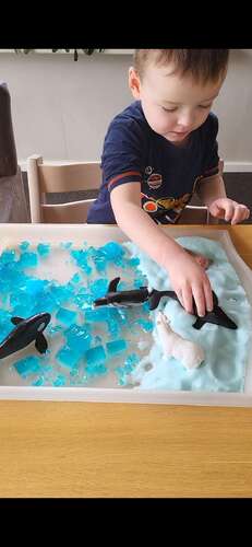Spuit scheerschuim of verf in een zipzakje, met verf kun je een paar klodders op papier doe en dat in het zakje. Door van buiten op het zakje te drukken en wrijven maken ze hun kunstwerk, terwijl ze schoon blijven. Bij scheerschuim wat kleine speelgoedjes erbij, die verdwijnen en tevoorschijn komen. Super grappig en schoon en veilig!!