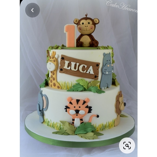 Wij bestelde 2 taarten (zoals op de foto, maar enkel bovenste laag. Geen stapeltaart) voor 2 kleine bubbelfeestjes. Alles is in thema van jungledieren. :-)