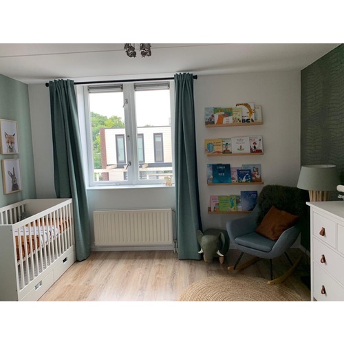 Wij hebben het ook zo, dus kortere gordijnen. Ze moeten alleen nog binnen komen, dus nog geen foto van t eindresultaat. We hebben een rechte rails. Bij ons aan de zijkanten van t raam niet veel ruimte ivm kast aan de ene kant en plankjes aan de andere kant. Dit zijn de gordijnen die wij hebben gekozen (verduisterend, van Kwantum). Gekozen voor neutrale gordijnen, was bang dat ze anders te druk zouden zijn in een toch wel vrij klein kamerje. 😄
