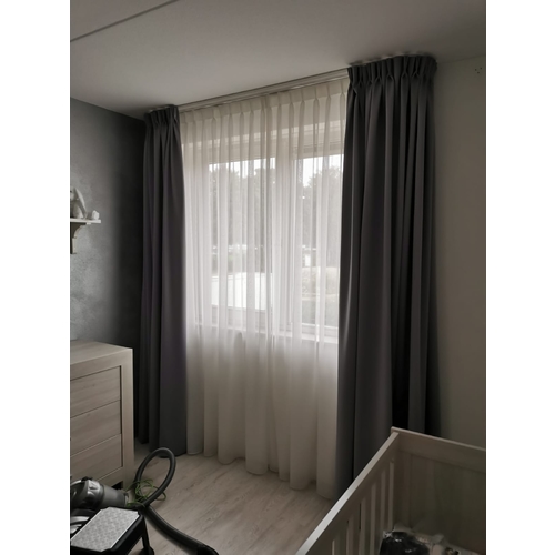 Wij hebben een verduisterend rolgordijn, en daarbij een mooie sierstok met antracietgrijs gordijn ook verduisterend van action!