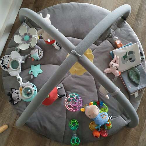 Dit zijn haar speelgoedjes. Speelmat van ikea ( heel tevreden van zeker prijs kwaliteit ) het blauw heeft ze van oma gekregen is nog geen giga hit, het boekje is van dreambee ook geen mega hit, roze rammelaar van hema ook geen hit, de bal en groene rammelaar zijn gekregen en vind ze heel leuk. Eerlijk gezegd speelt ze vooral in de relax met de speelboog van tiny love en dan haar tetradoeken.