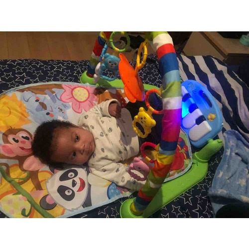 Het heeft Leuke standaard deuntjes en het geeft ook licht. Het heeft in het midden een leuke spiegel waar hij in kan kijken. Dus deze baby gym houd hem goed bezig hoor. Ik vind hem echt een topper als je het mij vraagt. Zo een simpel kleedje en het is makkelijk om mee te nemen.