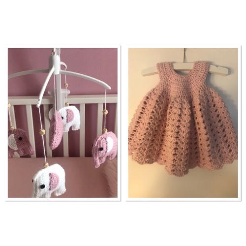Zelf de olifantjes voor de muziekmobiel gehaakt en een jurkje. Verder nog een konijntje en het volgende jurkje is in de maak