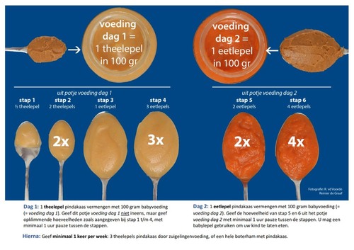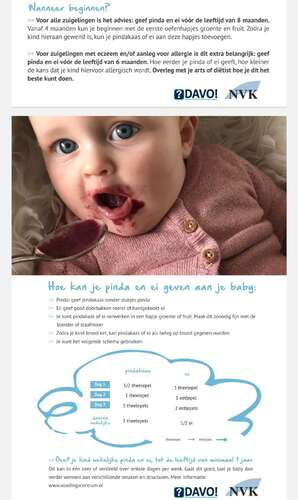 Vandaag bij het consultatiebureau geweest en de arts adviseerde om nu te beginnen met ei en pindakaas. Dochter is bijna 5 maanden. Ze heeft ook flink last van eczeem in het gezicht en dan heeft ze extra kans om allergie te ontwikkelen. Zo vroeg mogelijk beginnen is het beste volgens de arts. Deze folder met informatie heb ik toegestuurd gekregen van het consultatiebureau.