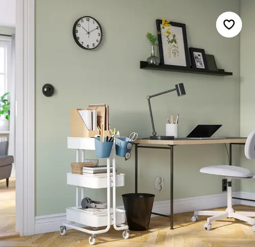 Misschien een haakje (zo'n klein S vormig haakje die je gewoon ovet de rand van de trolley hangt) met een papierklem eraan? Dan kan je de tekeningen daar in klemmen en aan een van die ijzeren dingetjes aan het haakje aan de rand hangen?
