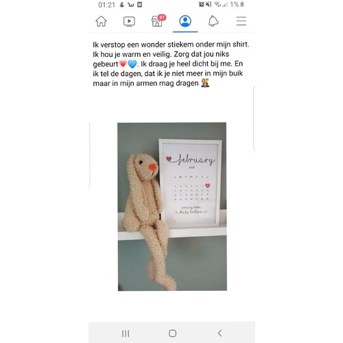 Ik gebruikte zelf geen Facebook, maar instagram. Ik had een filmpje geplaatst waarbij ik de zwangerschapstest liet zien aan me man en hij van vreugde me optilde en rondjes draaide.