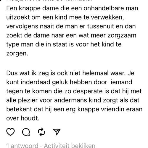 Meid stop met op sociaal media naar dit soort berichten kijken. Ik ken echt helemaal niemand in mijn sociale omgeving die zo over alleenstaande moeders denkt! Heb je dit zelf in het echte leven wel ervaren? Of is het enkel wat je op social media leest? Echt verwijder die troep of kijk alleen nog maar schattige katten filmpjes of zo. Want dit is echt niet goed voor je.