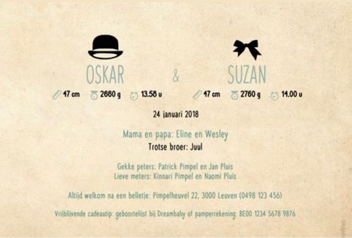 Pas 3 weken na de geboorte het kaartje versturen, met een opmerking 'bezoek op afspraak' oid. En 'cadeautip: ✉' of linkje naar een goed doel erbij!