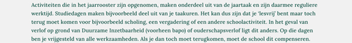 Hier ook in het onderwijs. Ik mocht (nadat ik zelf de vraag had gesteld, anders wist ik er niks vanaf) studiedagen en dergelijke dat ik verwacht werd wel opgeven. Je levert namelijk die uren in om vrij te zijn (ouderschapsverlof) en dan zou je tijdens die uren toch moeten komen opdraven? Klopt toch niet? Het is wel zo dat ik op papier 4 dagen werk, ik heb ook gekeken welke dagen het gunstigste zijn, de dinsdag ben ik dus gewoon “vrij” en wanneer er op dinsdag een vergadering of dergelijke is waarbij ik ook verplicht ben om te komen heb ik deze niet opgegeven als je snapt wat ik bedoel? Dus maandag ouderschapsverlof, dinsdag is gewoon geen werkdag: is er studiedag op maandag heb ik deze opgegeven en krijg ik die dag terug, is dit op dinsdag heb ik deze niet opgegeven.