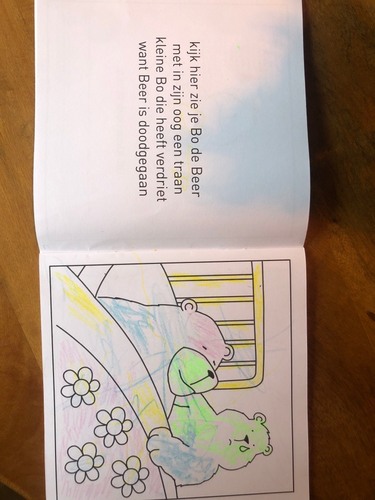 Wij kregen bij het overlijden van mijn schoonvader vanuit de uitvaartondernemer een boekje voor de kleinkinderen “Bo de Beer neemt afscheid”. Steeds links een paar regels verhaaltje en rechts een kleurplaat die erbij hoort.