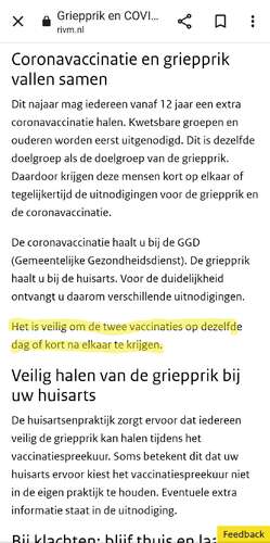 Ik ken meerdere mensen (uit risicogroepen) die beide prikken op dezelfde dag hebben gekregen, geen enkel probleem.