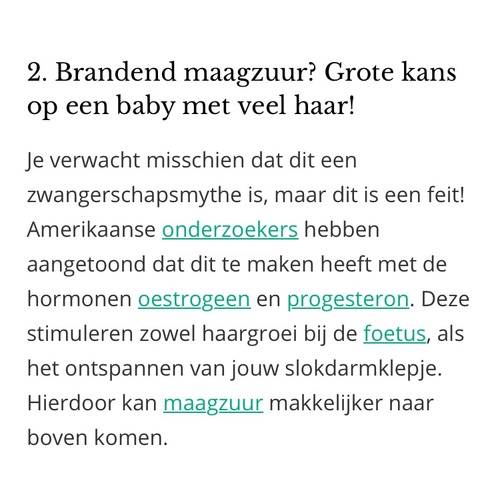 Ik heb erg veel last van brandend maagzuur wat omhoog komt en dus me slokdarm erg irriteert. Positivie wat ik ervan hoor en lees op internet is dat je kindje dan veel haar heeft. Iemand die mij meer hierover kan vertellen ?