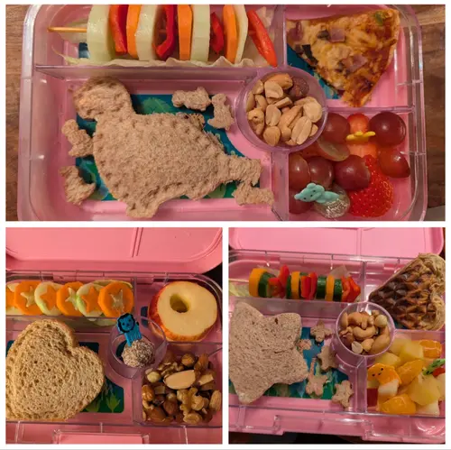 Koop een yumbox/ander lunchdoosje met vakjes, spiesjes, brood en groente uitstekend. Dan maak je er zo iets leuks van!
