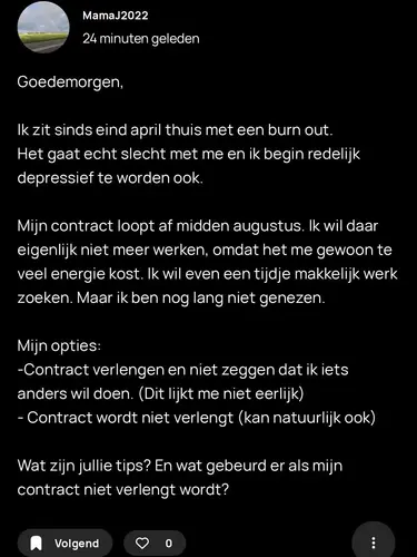 Ik had een tijdelijk contract en het ging al lange tijd niet goed met me. Op een dag stortte ik in en ik wist al wel dat ik hier niet meer naar zou willen terugkeren. Plan was om die dag naar huis te gaan, even rustig aan te die en de volgende dag terug. Echter bleef ik een halfuur lang huilen en gaf ik eerlijk aan dat ik mezelf niet meer zie terugkeren naar dit werk. Ik heb m’n spullen die dag ingeleverd en ben naar huis gegaan. Ik heb een paar gesprekken gehad met een bedrijfsarts uit protocol en die gaf ook al aan dat het contract bijna afloopt en het uwv me dan zal overnemen.