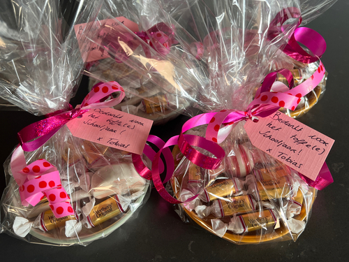 loop zo’n oud kopen schoteltje met bloemetjes en dat vullen met wat lekkers en in de folie doen?