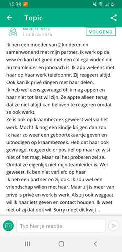 Ja ik heb met veel mensen contact op het werk. Ze reageert wel altijd op wh ...
