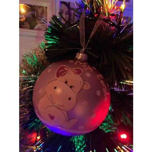 Wij hebben het iets anders gedaan. Alles voor mijn dochtertje heeft een walvis thema. Haar kamer, geboortekaartje, kleertjes, speenkoord, mobile, alles heeft walvissen. Dus heeft mijn vriend een walvis kerstbal voor haar gekocht. 😍😍