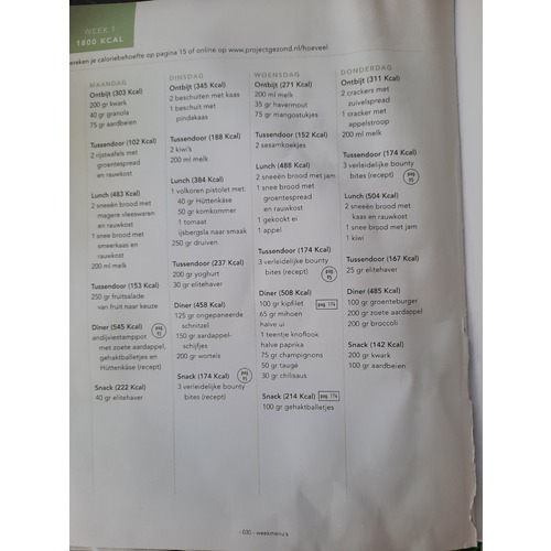 Ik gebruik het boek project gezond. Om af te vallen. Normaal moet ik 1500 kcal eten en toen ik zwanger was gebruikte ik de week menu's van 1800 kcal.