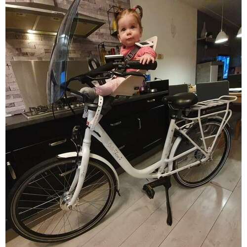 Nu staat mijn zadel best laag omdat ik anders niet met 1 voet bij de grond kan, maar nu kan ik niet meer over hem heen kijken. Oom kost het mij super veel moeite om hem in het zitje te krijgen, want dat is dan wat hoog voor mij en hij is dan veel te zwaar.