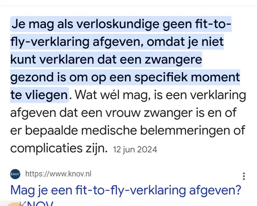 Een fit to fly wordt door mijn vk niet gegeven, een zwangerschapsverklaring wel. Ik zou even checken of die verklaring voldoende is. Niemand kan namelijk inschatten of jij echt fit bent om te vliegen.