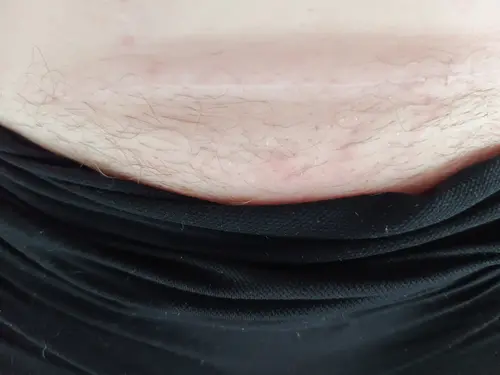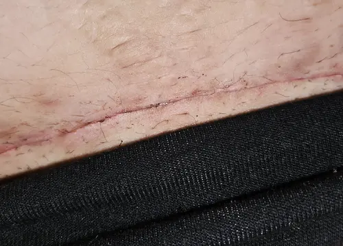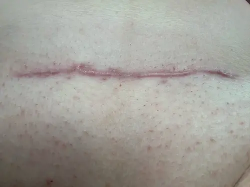 Het litteken is op dezelfde plek gedaan ja, alleen dus een stuk breder dus van lies naar lies.