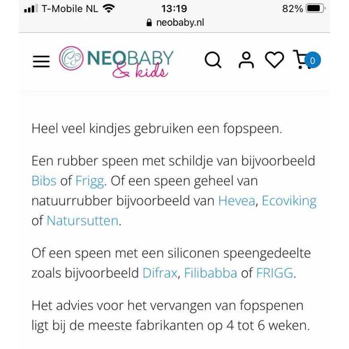 Met de siliconen hebben ze hetzelfde advies om een speen elke 4 tot 6 weken te vervangen. Wat ik weet is dat de webwinkels zelf geen geld terug krijgen van friggs als de speen langer dan 4 weken geleden gekocht is door de klant. Ik kon hem terugsturen omdat de speen nog in de verpakking zat omdat de kleine er nog niet is.