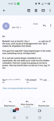 Is ie ook! Deze mail valt nog mee. Hij heeft me ooit beschuldigd van bedrijfsfraude, omdat ik whatsapp verwijderd had toen ik m'n telefoon inleverde. Nádat hij aan m'n deur thuis stond en ik net ziek thuis zat vanwege zwangerschap.