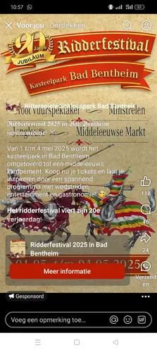 Ritterspiele bad Bentheim! Is echt ontzettend gaaf, wij gaan elk jaar. Leuke voorstellingen van ridders op paard, lekker ouderwets eten van een varken aan het spit en allemaal ander soort eten wat je normaal nergens koopt. Je waant je echt in de middeleeuwen