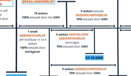 Het overlapt op het plaatje alleen omdat je de 5 aanvullende weken geboorteverlof binnen een half jaar (6 maanden) op moet nemen . De 9 weken ouderschapsverlof moet je binnen een jaar (12 maanden) opnemen. Je mag zelf bepalen wanneer je deze weken opneemt, maar het moet wel binnen die termijn!