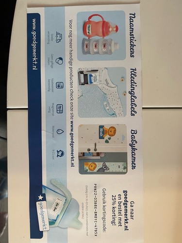 Ik heb wel een kortingscode, zal er morgen naar kijken voor je. De labels moet je bij de naden strijken aan de zijkanten, want anders zie je ze wel inderdaad. Kan ook daar morgen een foto van maken