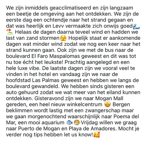 Misschien niet zo leuk, maar wel een oprechte tip. Neem dichte schoenen mee indien je kindje al loopt. Toen wij er waren, al even geleden, zal het vol met kakkerlakken. Puerto de Mogan is heel leuk, maar daar zaten er echt heel veel. Vooral in de avond zag je ze. Niet zo fijn misschien met open schoentjes. Ik hoop dat het inmiddels is verbeterd.
