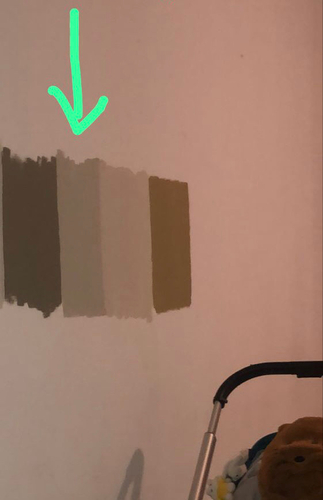 Die bij de groene pijl is green tea. Die er rechts naast is Sandy beach. De sandy beach hebben wij beneden op de lange muur in de woonkamer en de gouden op de kleine muur achter de tv 😏
