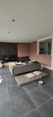 Wij kwamen in een huis met een uitgesproken oranje tegelvloer. Ik heb wel dertig kleurplaatjes uit de bouwmarkt meegenomen om thuis te zien wat daar het mooiste bij paste. We hebben een lichte terracotta-achtige tint en een grijze muur erbij. Een paar tinten verschil maakte heel veel uit. Licht doet ook veel idd.