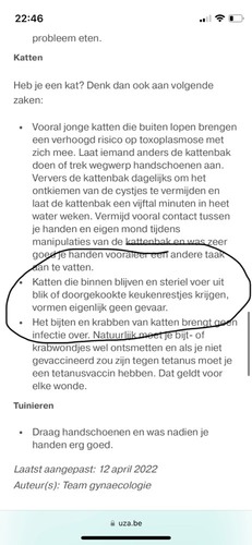 Ik ben getest op toxoplasmose toen we voor een kindje wilde gaan, deze was negatief. Wat inhoud dat ik in die 12 jaar dat ik dit vak doe en zelf katten heb, nooit besmet ben geraakt.