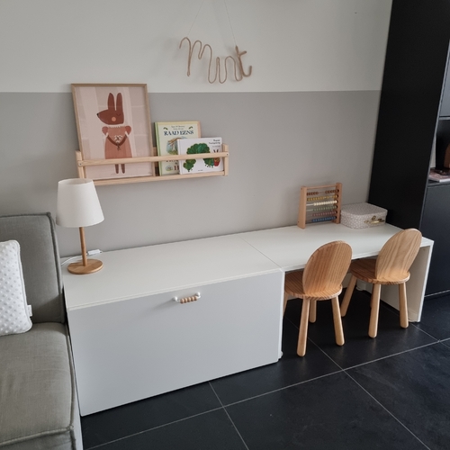 Wij hebben nu een aparte speelkamer en zelfs hier hebben we hoge, dichte kasten waar alles in opgeborgen is. Daarnaast een lange plank aan de ene wand met 4 stoeltjes er achter (met hun namen er op, ookal doet baby van 15 weken nog lang niet mee daar😜)
