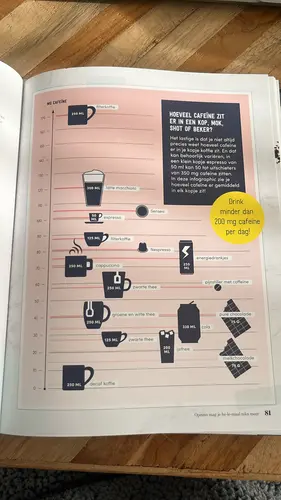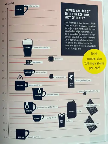 Ik doe 1 koffie-drankje per dag. Dat kan een gewone koffie zijn, een espresso, een late macchiato. Ik let niet op de grote of de sterkte. Dus soms zal het misschien het equivalent van 2 of 3 koppen koffie zijn geweest. Maar dit maakte het voor mij makkelijker dan de caffeine proberen te berekenen.