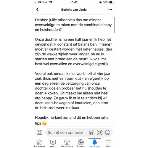 Ik heb zelf aan het eind van het verlof getwijfeld of ik wel weer kon starten, 2 weken voor het eind is de kleine gestart bij de opvang, dat gaf mij weer wat lucht en ruimte. Ik ben toen wel weer gestart met werken, maar uiteindelijk toch ook uitgevallen.