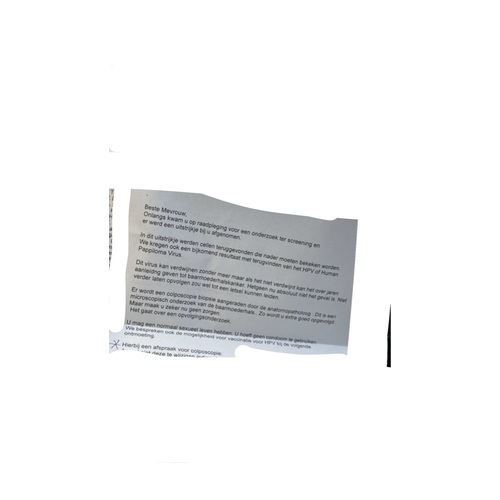 Zie in bijlage mijn foto dat ik ontvangen heb van de arts. Het was vrijdag dat ik het las ik was in chock en paniek. Vandaag na de middag heb ik een afspraak met mijn huisarts om alles te bespreken omdat ik haar zei ik kan niet wachten tot eind maart tot de gynaecoloog mij zal zien voor een colposcopy...