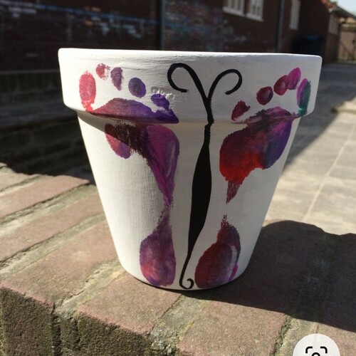 Ik had een simpele bloempot met plantje gekocht. Toen de voetjes in de verf en die als een vlinder op de bloempot geschilderd.