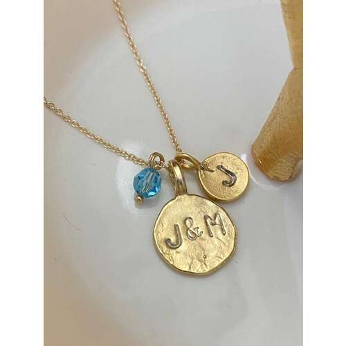 Ik heb deze ketting met de initialen van mij, m'n vriend en de kleine en hun geboortesteentje. Gekocht via een Etsy