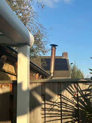 Bedankt voor je reactie! Dit speelt al heel lang, al ruim voor mijn zwangerschap. Maar omdat ik niet zo wil ‘zeuren’ heb ik er nooit eerder wat van gezegd. Mensen die hier op bezoek komen zeggen ook dat het echt flink stinkt! Alle ramen zijn dicht, en zitten niet van die ventilatie dingen boven, dus dat kan het niet zijn. Zie op de foto de “hoogte” van de schoorsteen (ongeveer precies de hoogte van de slaapkamerramen), dat is de reden dat het door alle kleine kiertjes komt. De afvoer is veeeeel te laag.
