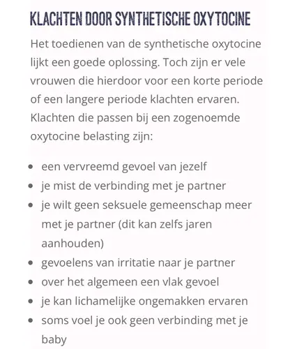 Dit heb ik afgelopen jaar laten doen. Bij mijn eerste en derde bevalling oxytocine toegediend gekregen ivm niet vorderende weeën en gebroken vliezen. Bij mij kwam het in de vorm van druppels. Ik had ook veel last van borstontstekingen (gaf nog borstvoeding)en merkte dit direct als reactie elke keer dat ik weer startte met de kuur.